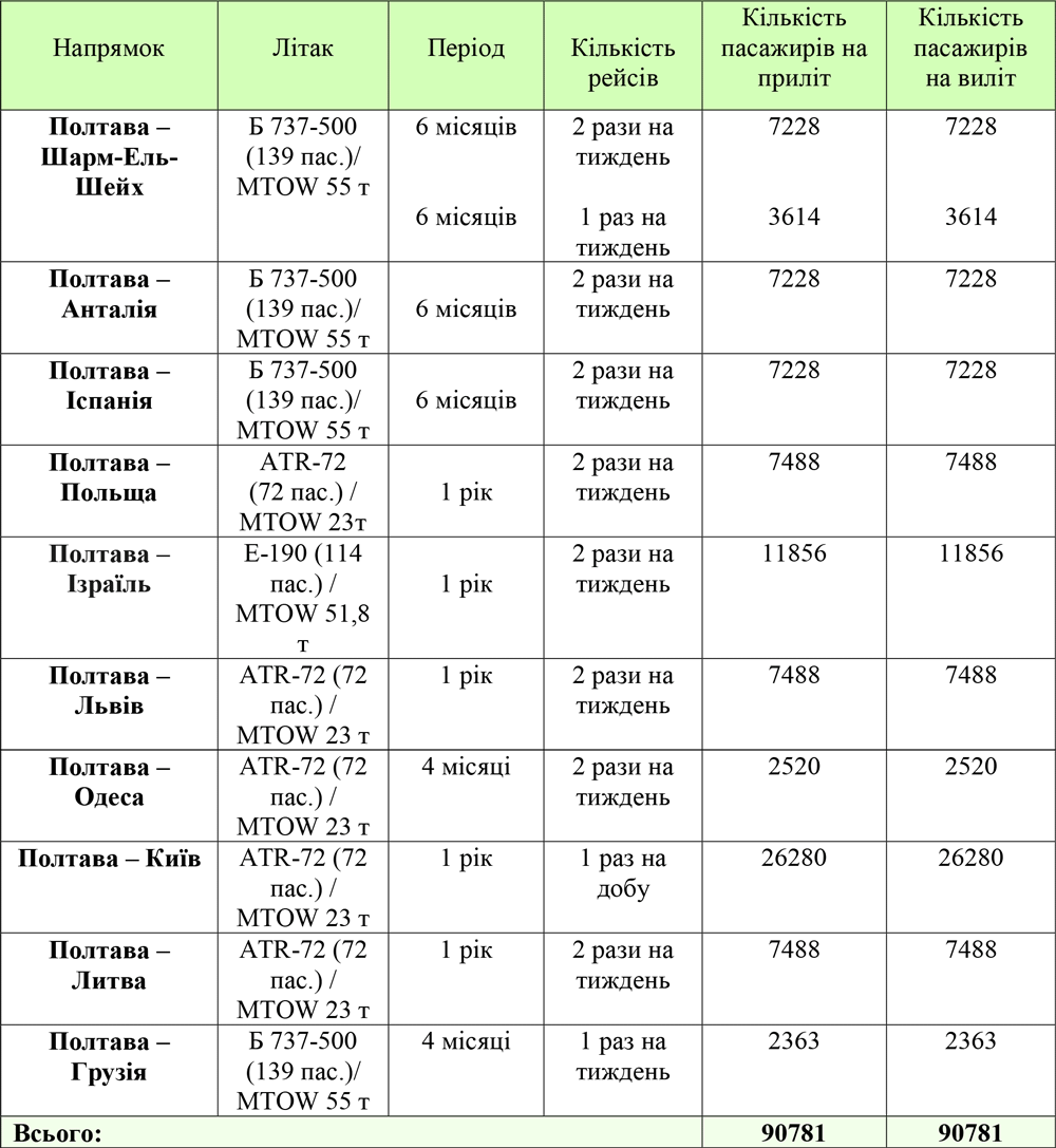 За розрахунками управління інфраструктури та цифрової трансформації, оновлений аеропорт прийматиме та відправлятиме літаки за 10 напрямами, більшість з яких — міжнародні. Найчастіше хочуть здійснювати рейси у Київ — раз на день.