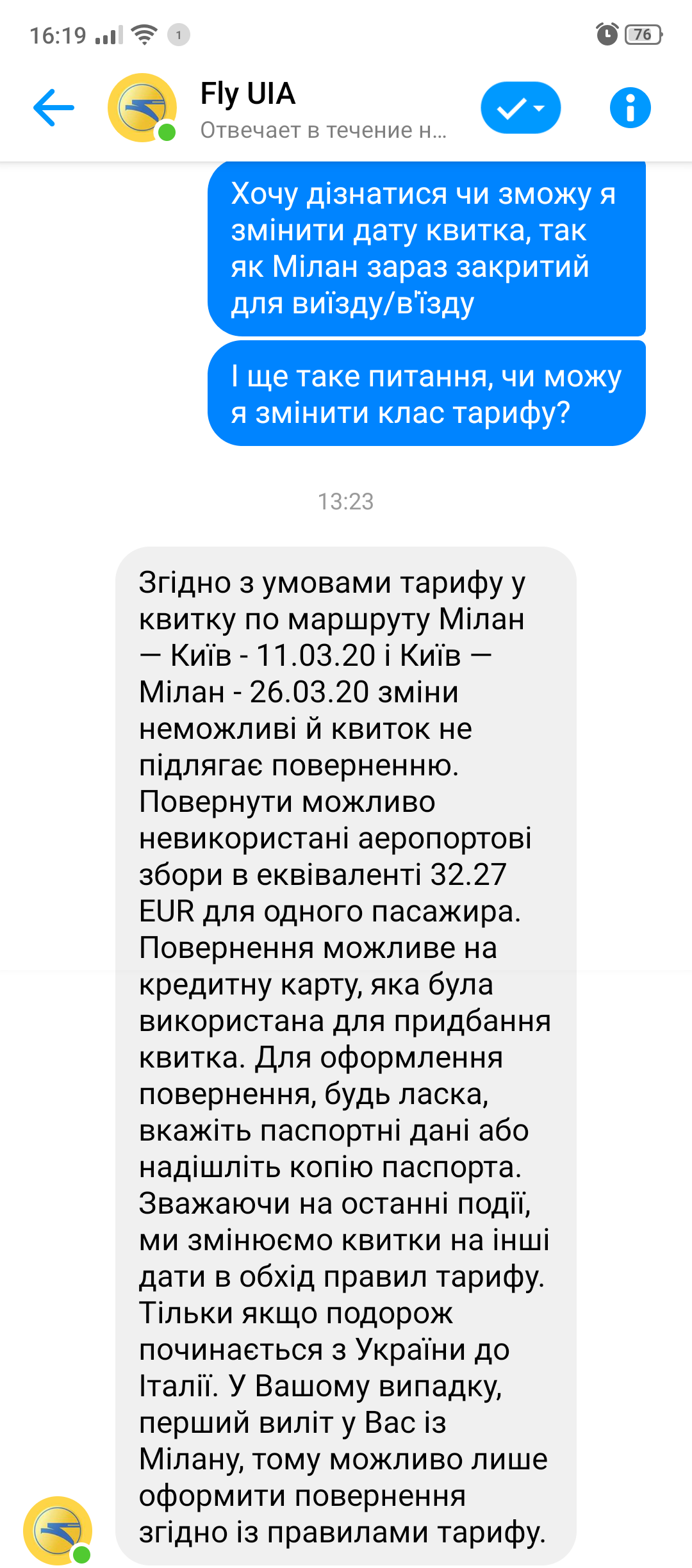 Я тільки що телефонувала знову до колл центру, сказали що мені взагалі не доступні ніякі опції зміни класу тарифу/дати так як в мене тариф лайт, і виліт не з Києва в Мілан, а Мілану в Київ. Ось така "многоходовочка". Компенсація дійсно буде доступна тільки у разі відміни зі сторони авіакомпанії даного рейсу :?: