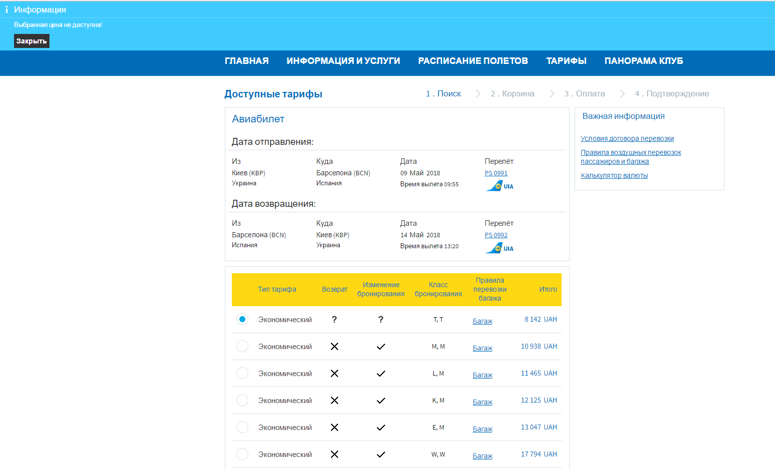 Да, точно отвалились лоукост тарифы - попробовал сделать на 14 мая Киев-Барселону как на скрине ранее, но там уже нет такого.