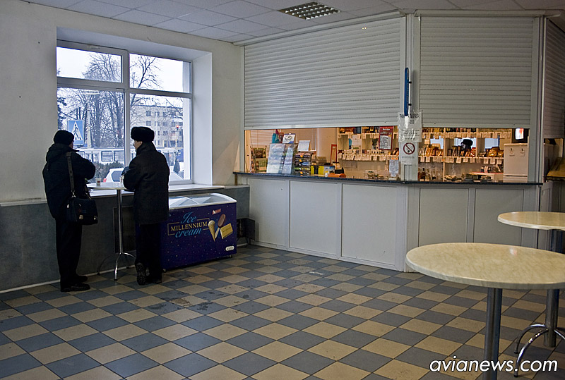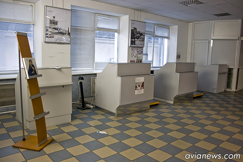 Заходим в терминал. В левой крыле зал регистрации с 4 тумбочками и зал ожидания с 4 тумбочками. Тумбочки это "стойки регистрации