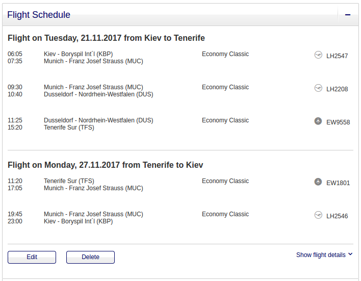Не могу найти, сделай плиз скринmakor писав:21-27 ноября Киев-Тенерифе на сайте Люфтганзы Киев-Тенерифе 6270 грн с багажом и короткими стыковками... Единым билетом)))