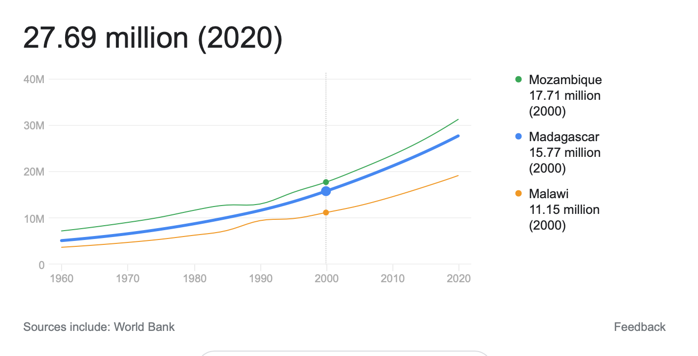 Давайте посмотрим на Мадагаскар: Доступность еды по Global Hungry Index за последние 20 лет улучшилась. А вот в деталях все хуже - красная линия показывает, что % населения с недостатком питания сильно вырос, а улучшение индекса получается за счет других показателей. При этом население Мадагаскара, как и большинства других африканских наций за последние 20 лет практически удвоилось. То есть, еды в стране за последние 20 лет стало существенно больше: