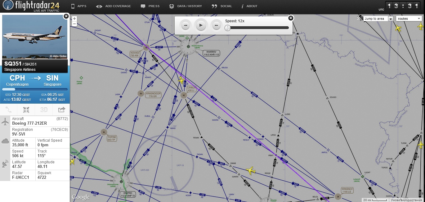 Добрый день. А можно Вас попросить сделать такой-же скриншот для рейса SIA351 17.07 в момент катастрофы. Как этотKKS писав:Здається в цій темі не було інформації про те що борт саме перед Донецькою областю - відхилився від траси.