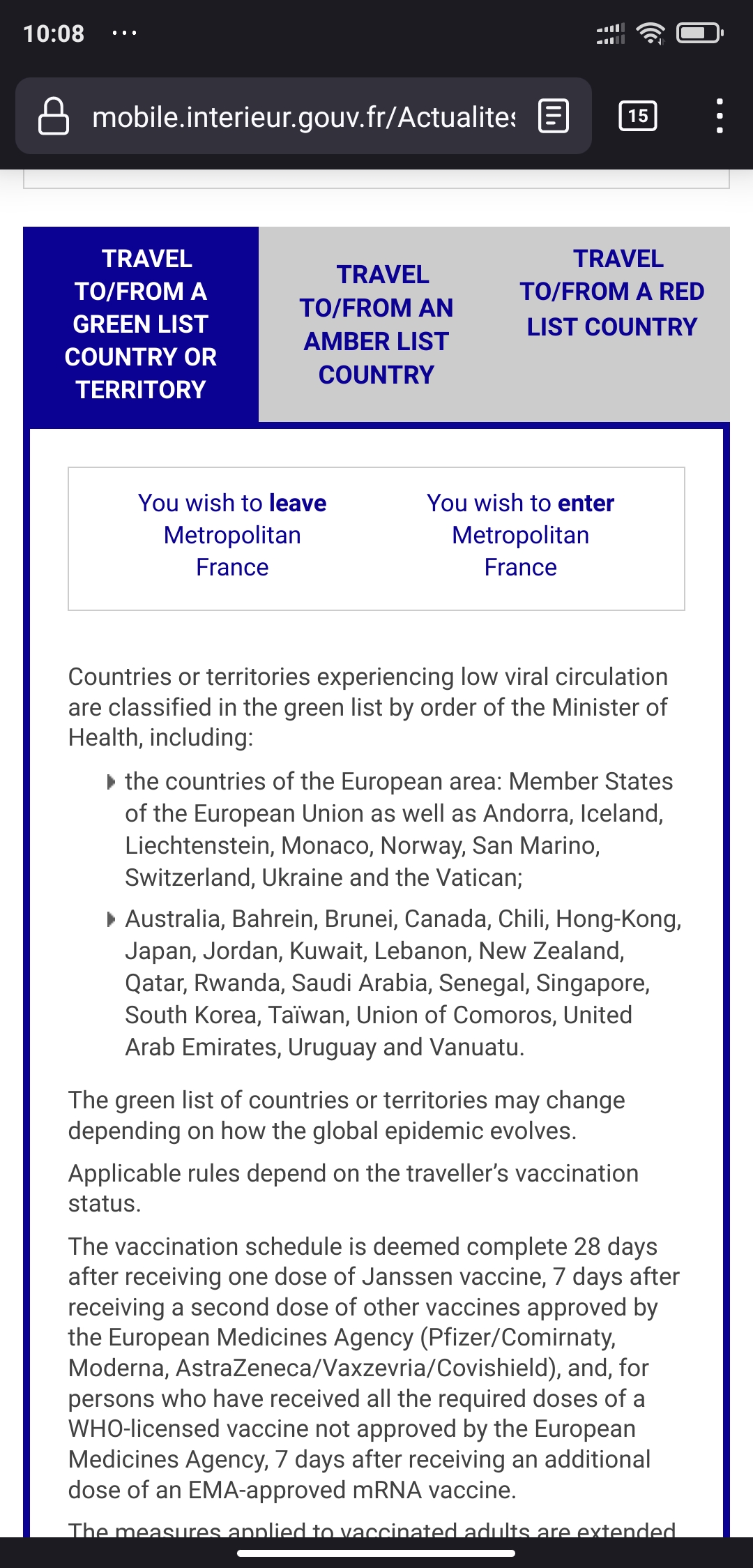 “Green list” countries or territories : Countries where no active viral circulation has been reported and no relevant variants identified. These are European area countries, plus Australia, Bahrein, Brunei, Canada, Chili, Hong-Kong, Japan, Jordan, Kuwait, Lebanon, New Zealand, Qatar,Rwanda, Saudi Arabia, Senegal, Singapore, South Korea, Taïwan, Union of Comoros, United Arab Emirates, Uruguay and Vanuatu.