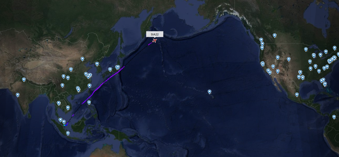 С этим там все нормально - 370 минут. Причина именно в направлении ветра. Из Ньюарка в Сингапур он должен лететь по маршруту через полюс.