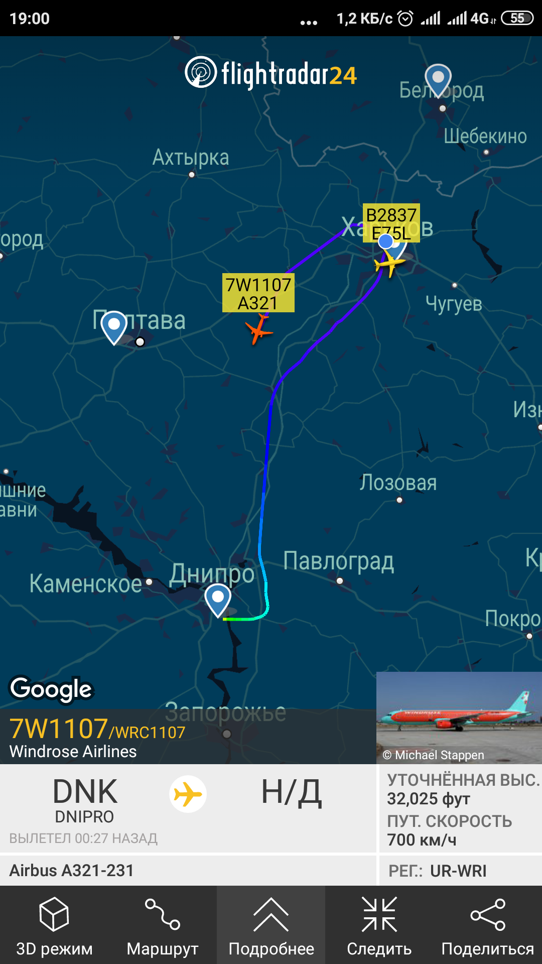 Только что над центром Харькова пролетел на 32000 футов строго на север.. давно такого не видел уже, посмотрел в fr24, а это виндроуз что-то попутал в небе..