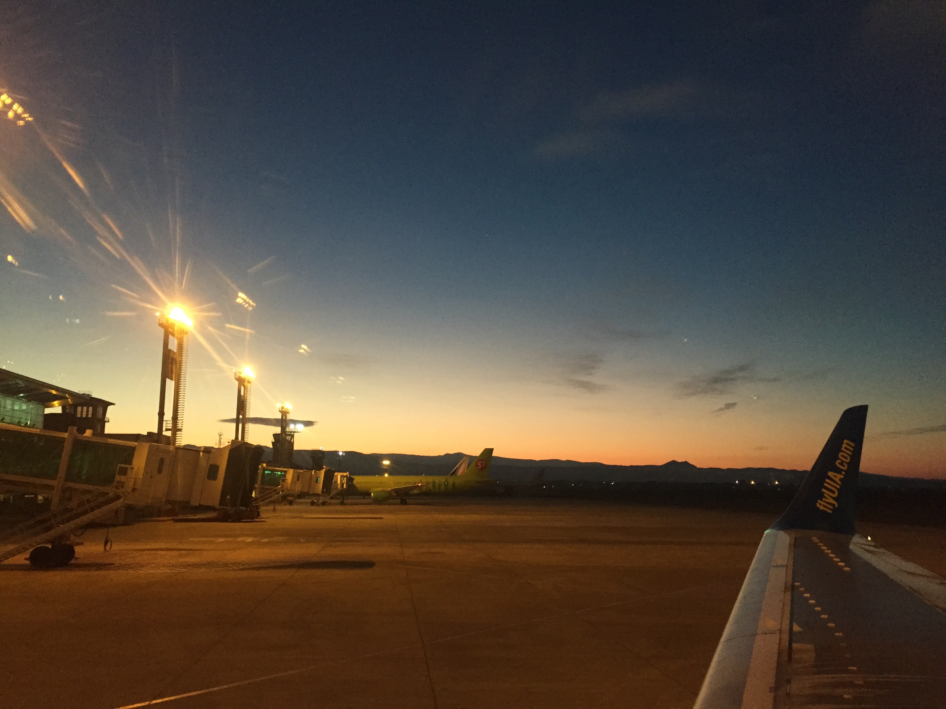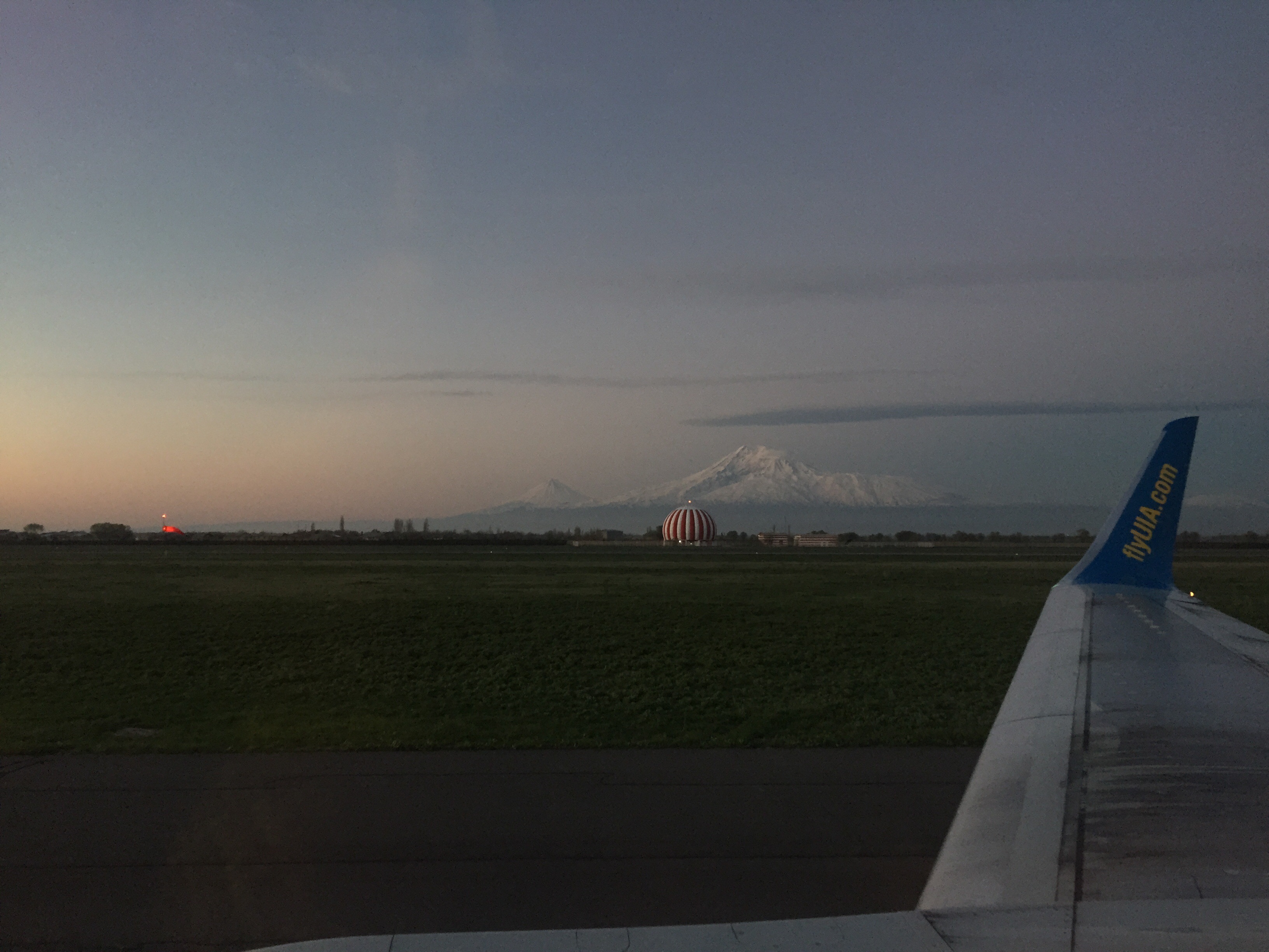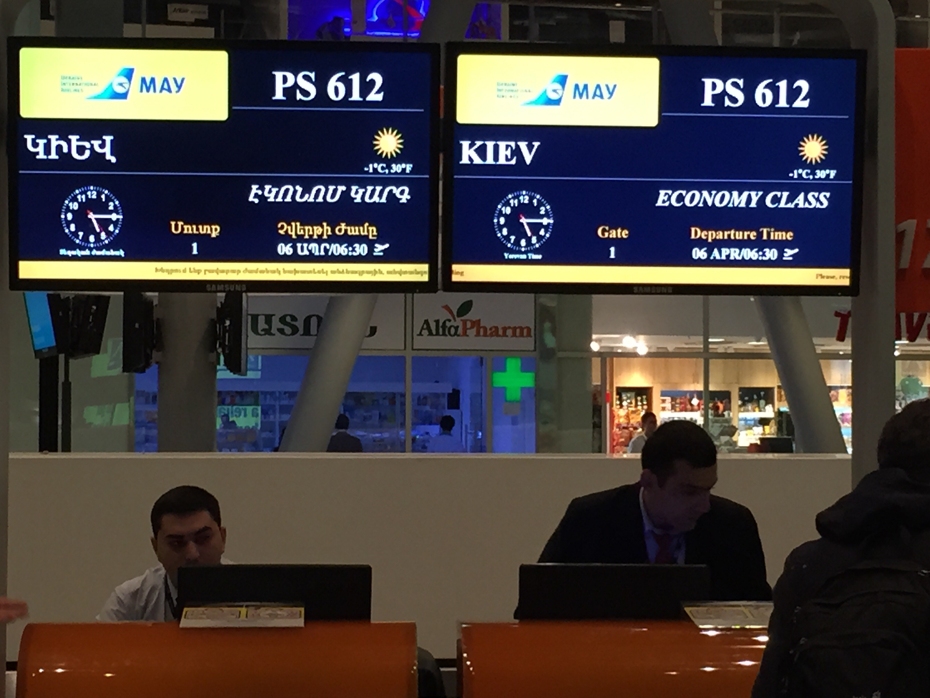 Последнее время пытаюсь активно пользоваться появившейся у МАУ возможностью летать куда-то на выходные по вменяемым ценам (вечерний вылет в пятницу и ранний возврат в понедельник). Очень радует, что, наконец-то, из Киева появилось много возможностей для таких поездок. На этих выходных слетал, наконец-то, в Ереван (билет был около 100 евро, раньше они были по 300-400 баксов). Борт из Киева (Эмбраер) - полный и очень много транзитных пассажиров. Вечерний разлёт из Борисполя впечатляет (к сожалению, не удалось сделать фото, когда ещё все самолёты стоят у гейтов--где-то в 19:00) (Единственный "чужой" самолёт в это время, стоящий у терминала--Белавиа, т.е. они реально имеют очень жирный слот). В Борисполе объявляли задержки нескольких рейсов "в связи с поздним прибытием группы трансферных пассажиров). Нас не задерживали, но, когда всех уже вроде бы автобусы довезли до борта, мы всё ещё кого-то ждали, и потом вбежали два взмыленных пассажира. Вылетели с небольшим опозданием. КВС объявил, что время в полёте--2:20. Облетали Крым, залетали на территорию Турции сразу за Трабзоном и потом чуть южнее Карса влетали в Армению, а там, практически сразу, и Звартноц. По дороге в Борисполь я купил себе запаянные сендвичи, которые раскрыл, когда по салону разносили еду. Мне пожелали приятного аппетита и налили воды. Видел, как люди активно что-то покупали, некоторые ели полноценные 9-евровые обеды.
