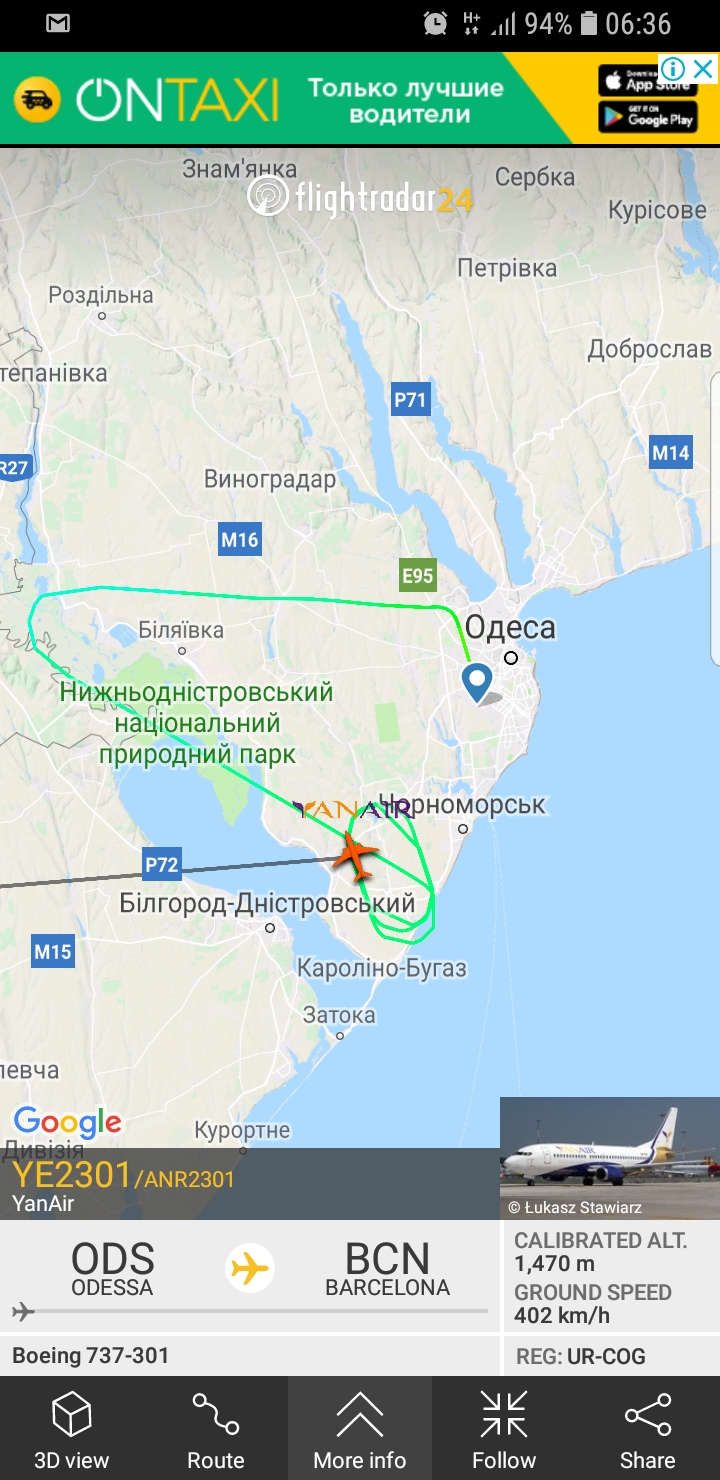 Годину тому літак вилетів з Одеси у напрямку Барселони. Відлетів максимум кілометрів на 20. Зараз нарізає кола.