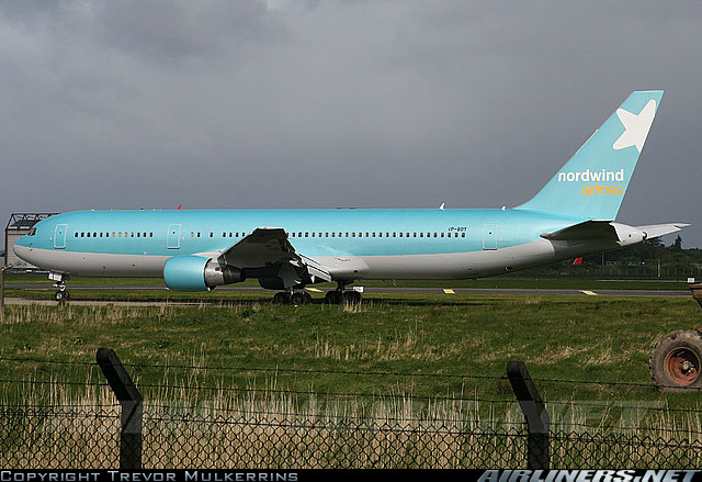 Boeing 767 -3G5 29435 720 VP-BOY Nordwind Airlines at SNN 13may13 in light-blue scheme prior wet-lease ops for? ex EI-CZH