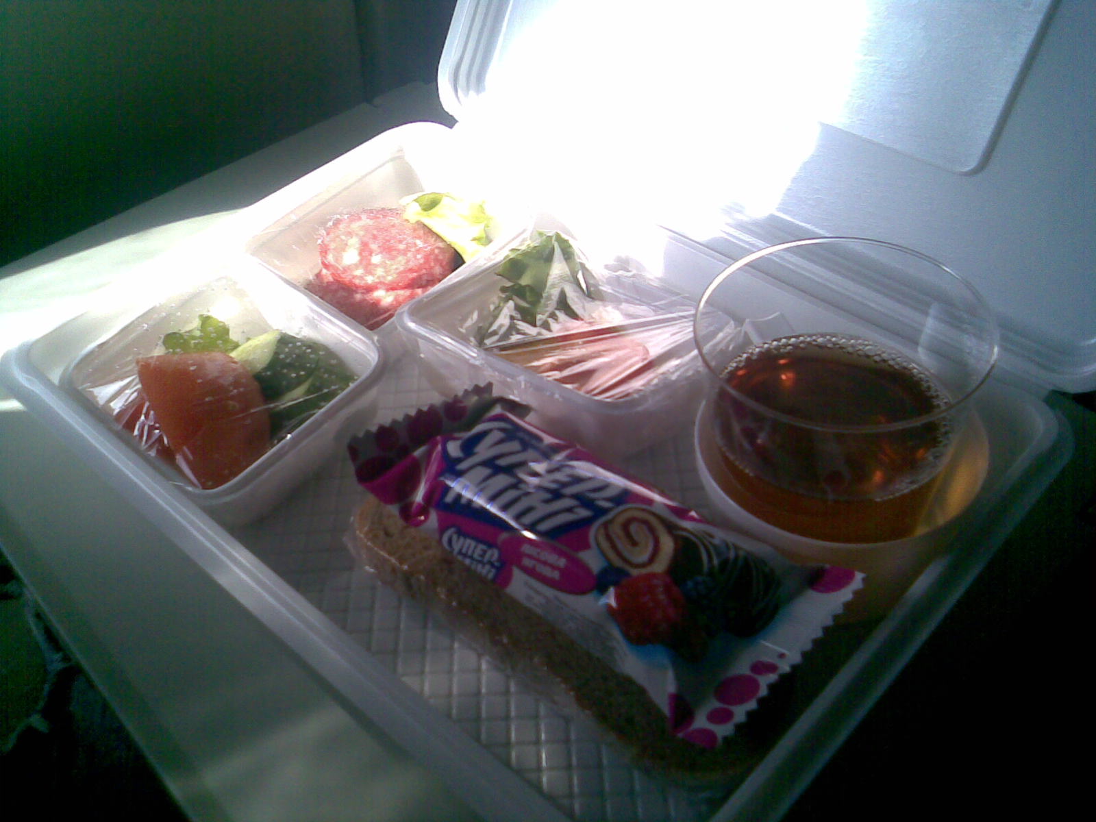 У аэросвита бутерброд представлял просто разрезанную булочку с вложенным куском ветчины - при полёте туда, и вложенным сыром - обратно. Завёрнуто было всё в обычную плёнку.
