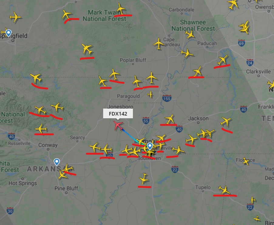 Ого! Разлёт самолётов Fedex из одного аэропорта. 95% вылетевших самолётов Fedex, подчеркул красным. И ещё 6 стоят в очереди на вылет.