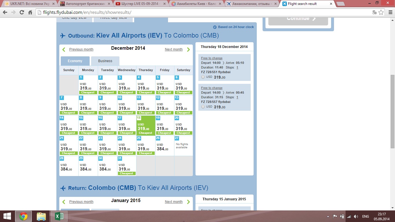 Если совсем грустно будет, то в CMB - любые даты, в IEV c 19/01/15boltik писав:Нужны билеты с вылетом середина декабря и обратно середина января. И на эти даты не могу найти таких билетов. Может у Вас есть какой-нибудь промо код?jores писав:У flydubai 654$ - ординарная цена для IEV-CMB RT без всяких акций и промо тарифов. А чтобы посоветовать что-то интереснее, предоставленной вами информации явно не достаточно для хорошего совета.boltik писав:Очень нужна помощь!!!!!!!
