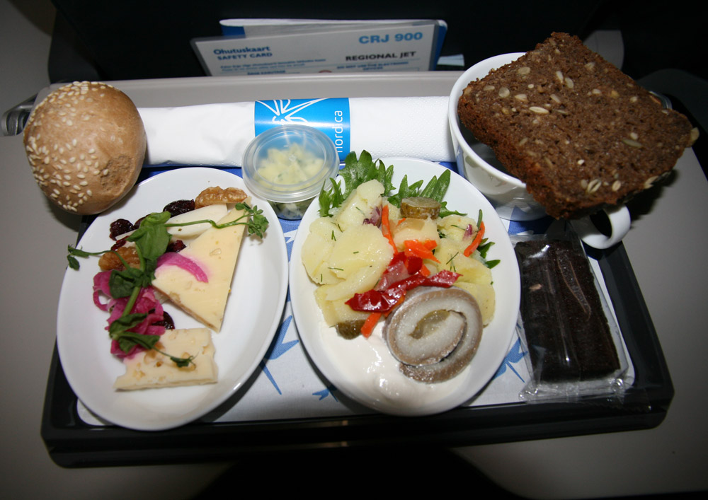 пам'ятаю, колись давно летів бізнесом Київ-Таллінн на приснопам'ятних Estonian Air, так тоді годували екзотикою — акулячим м'ясом. на вибір було 3 меню, але два інших не пригадую вже.
