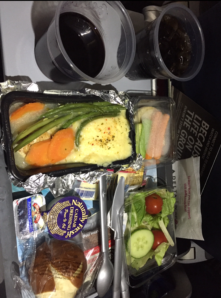 Ужин, перед прилётом—мини-завтрак из коробочки. На каждом сиденье сразу лежала бутылка воды 0.5. В отличие от КЛМ, где вино подаётся в бутылках, в Дельте бортпроводники наливают его из огромных бутылок (литровых или даже больше) в стаканы. Стаканы у Дельты больше и покрепче КЛМ-овск х да и вообще любых европейских.
