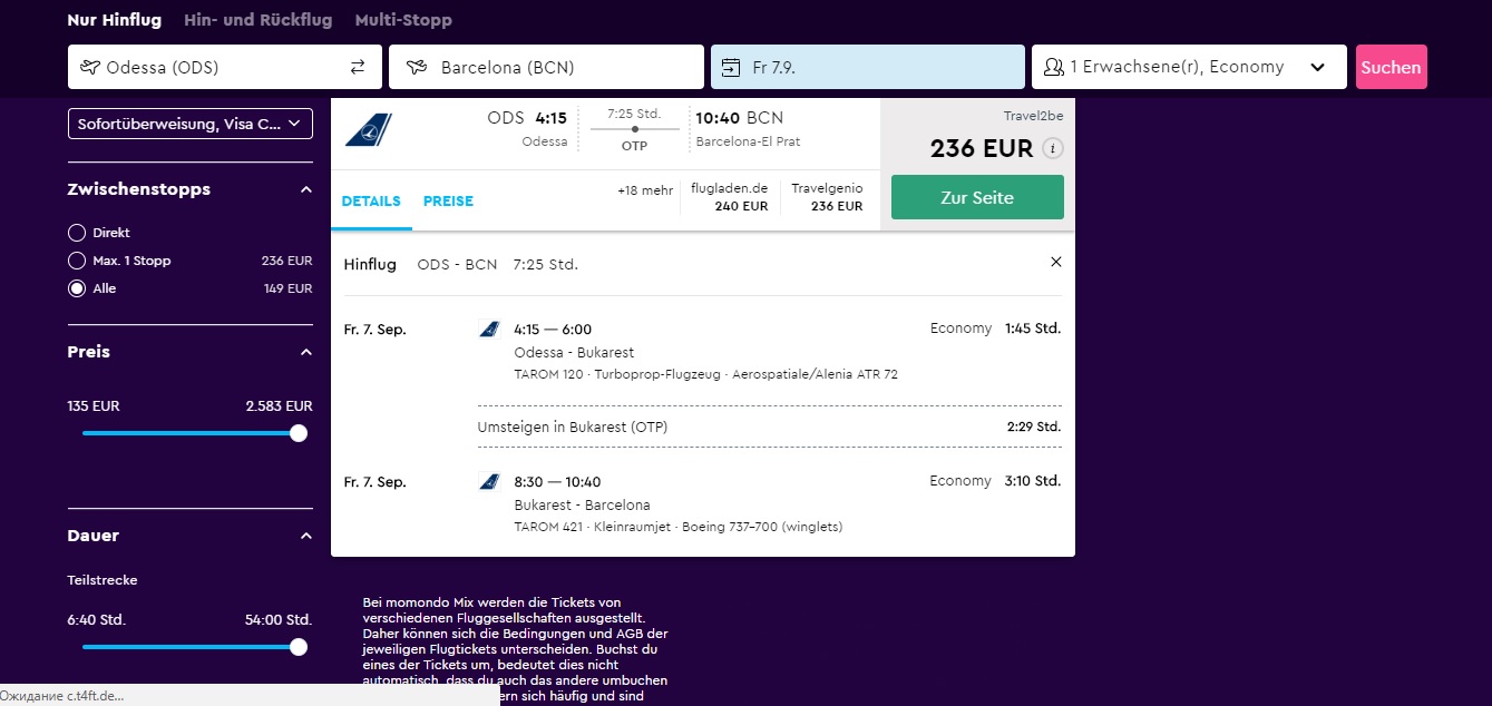 Хотя Одесский аэропорт официально не объявлял о заходе Тарома, а на сайте Тарома в списке аэропортов до сих пор нет Одессы, и их ФБ мне ответил, что не может мне ничего конкретного сказать по продажам, я нашёл через аггрегатор с сентября билеты через Бухарест. Может, кому-то интересно.