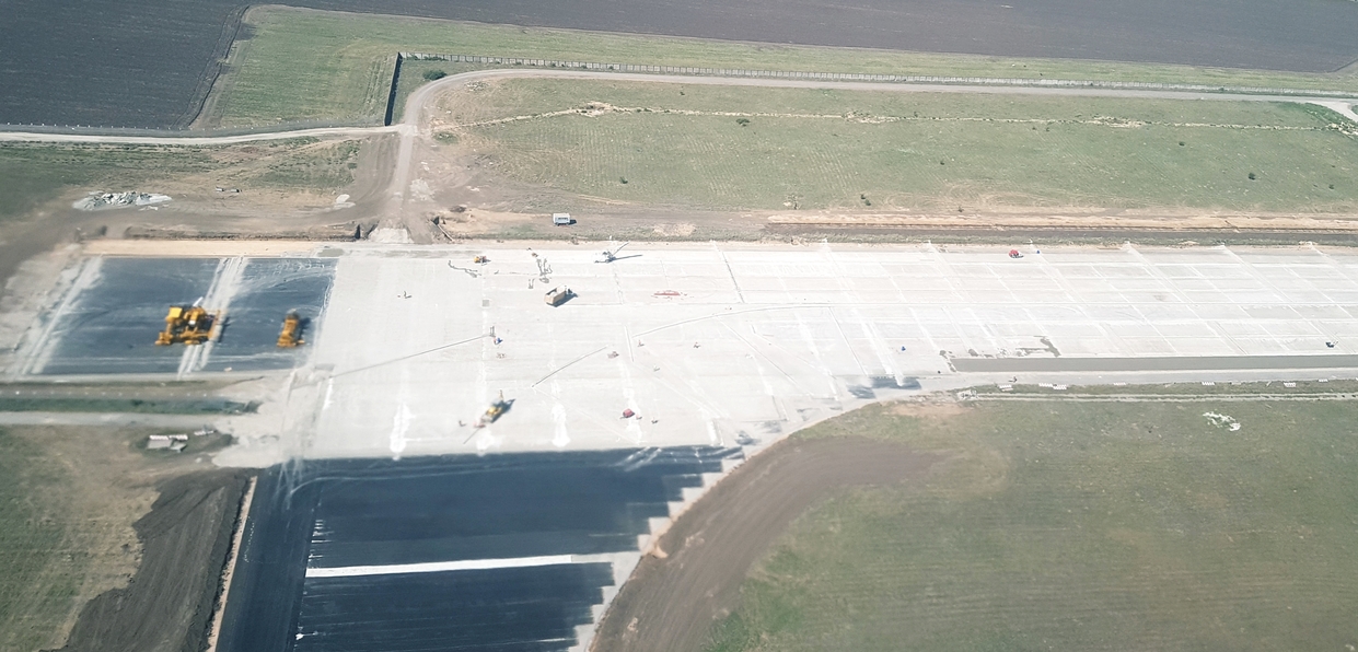 Земляные работы на сегодняшний день выполнены почти на 90%. Начиная с южного торца ВПП, на участке примерно 1300 метров уже уложено несколько слоев так называемой «подушки» основания, разделенных синтетической решеткой с последующей стабилизацией двумя 10-сантиметровыми слоями щебня. Сверху сформирован песчано-цементный слой толщиной 15 см и 30-сантиметровый слой «тощего» бетона.