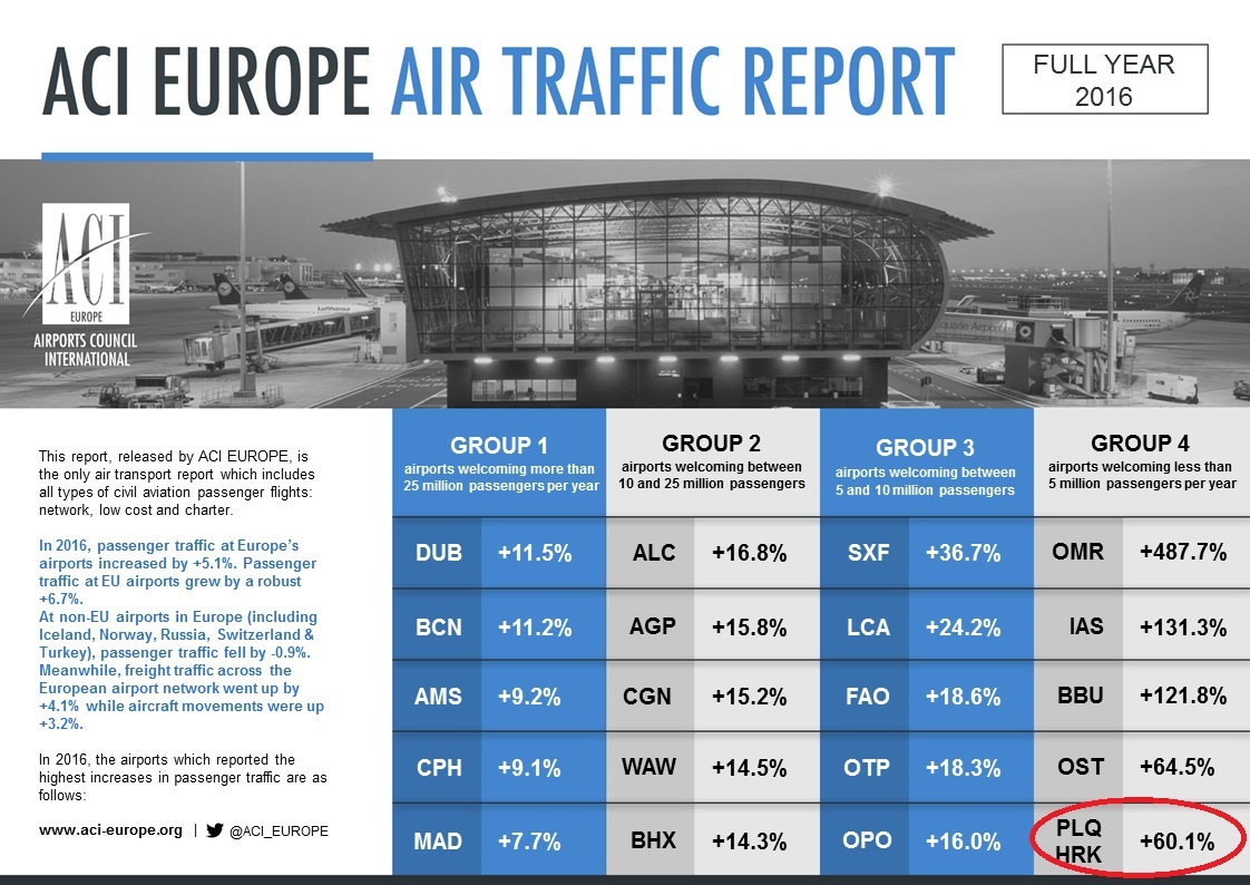 Международный аэропорт Харьков стал единственным представителем Украины, вошедшим в рейтинг международного совета аэропортов ACI EUROPE (Airport Council International). Харьковчане были определены в 4 группу (аэропорты с пассажиропотоком менее 5 миллионов человек), и наравне с аэропортом Паланги (Литва) Харьков показал прирост в +60,1% по сравнению с предыдущим, 2015, годом.