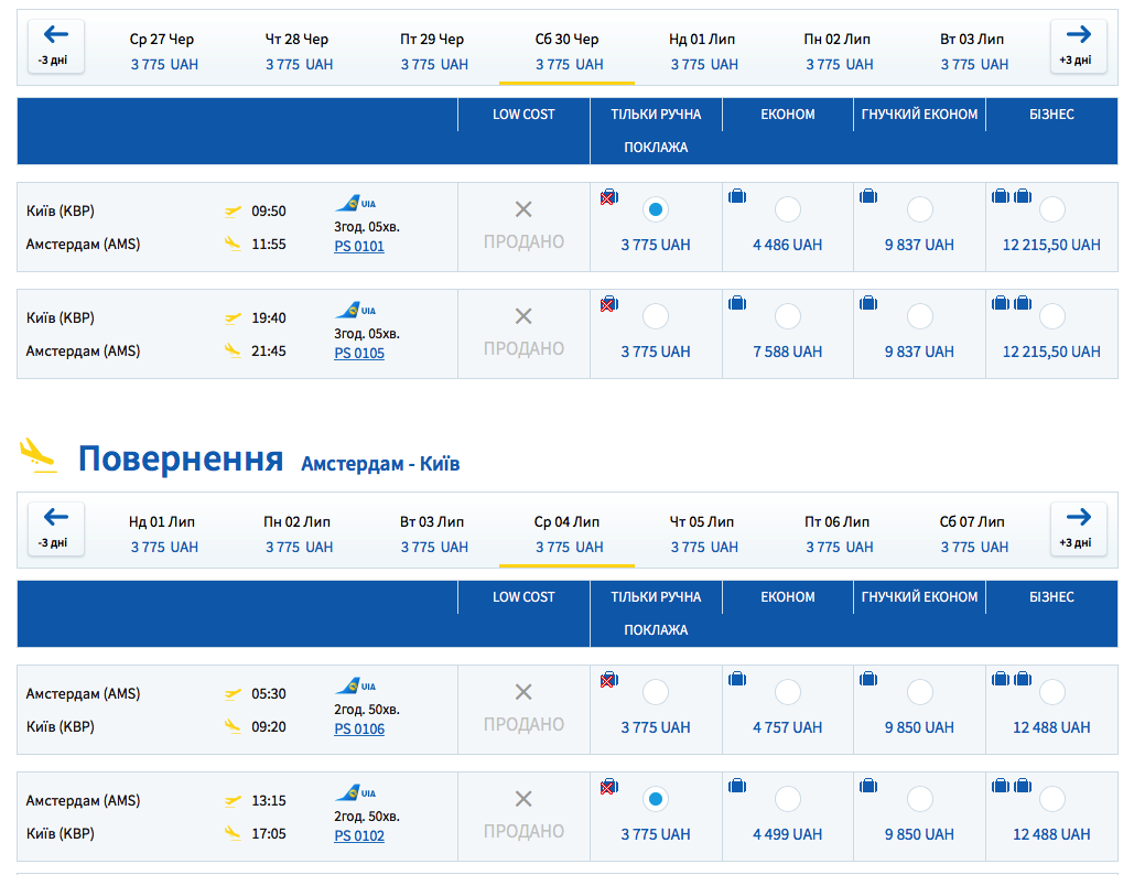 Киев-Амстердам 30 июня 699 грн стоит сейчас. Конечно же их нет в Амстердам, я и вижу)))