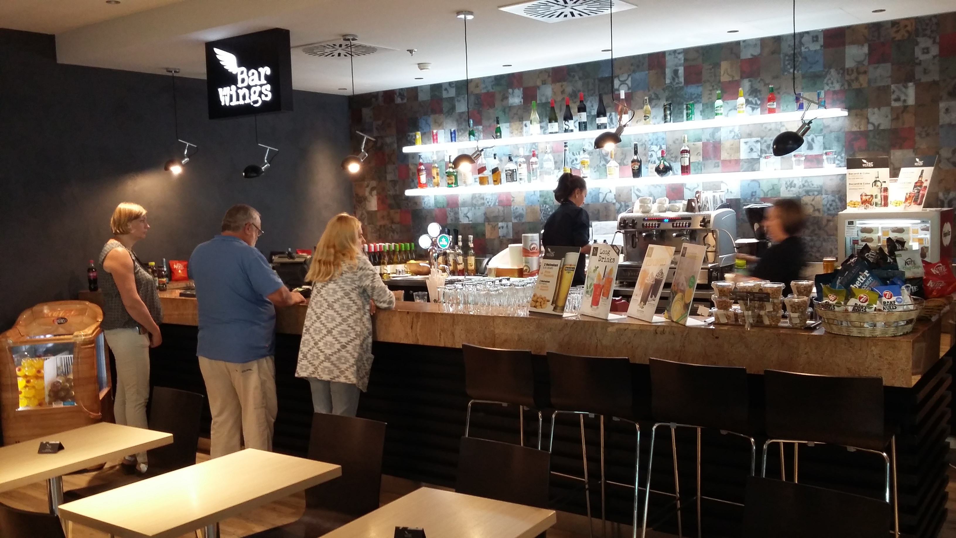 Спустились, прошли, гейт 9В, как на ладони, а никаких признаков лаунжа нет. Поймали еще какого-то парня с бейджиком, говорим, покажи пальцем, где. Чего он там стоит и ничего не знает ,так и не поняли, но он позвал еще какую-то сотрудницу, которая нас и подвела к малозаметной лестнице наверх. Второй лаунж показался на порядок проще, как по размерам, так и по содержанию. И дамы, что встречают, уже не аристократки из Парижа, а студентки, которые вообще не понимают, чего их сюда судьба занесла. Показываю им пригласительные, а они смех сдержать не могут. Говорю, чего ржем , давайте рассказывайте, где тут что у вас. А они, уже в слезах от смеха говорят: " Вы не поверите, но здесь тоже не ваш лаунж и обслуживать вас по таким бегункам мы не будем, а место ваше - на 2 этаже, найдите там Wings bar и там можете от души насладиться сервисом для пассажиров, путешествующих бизнес классом МАУ".