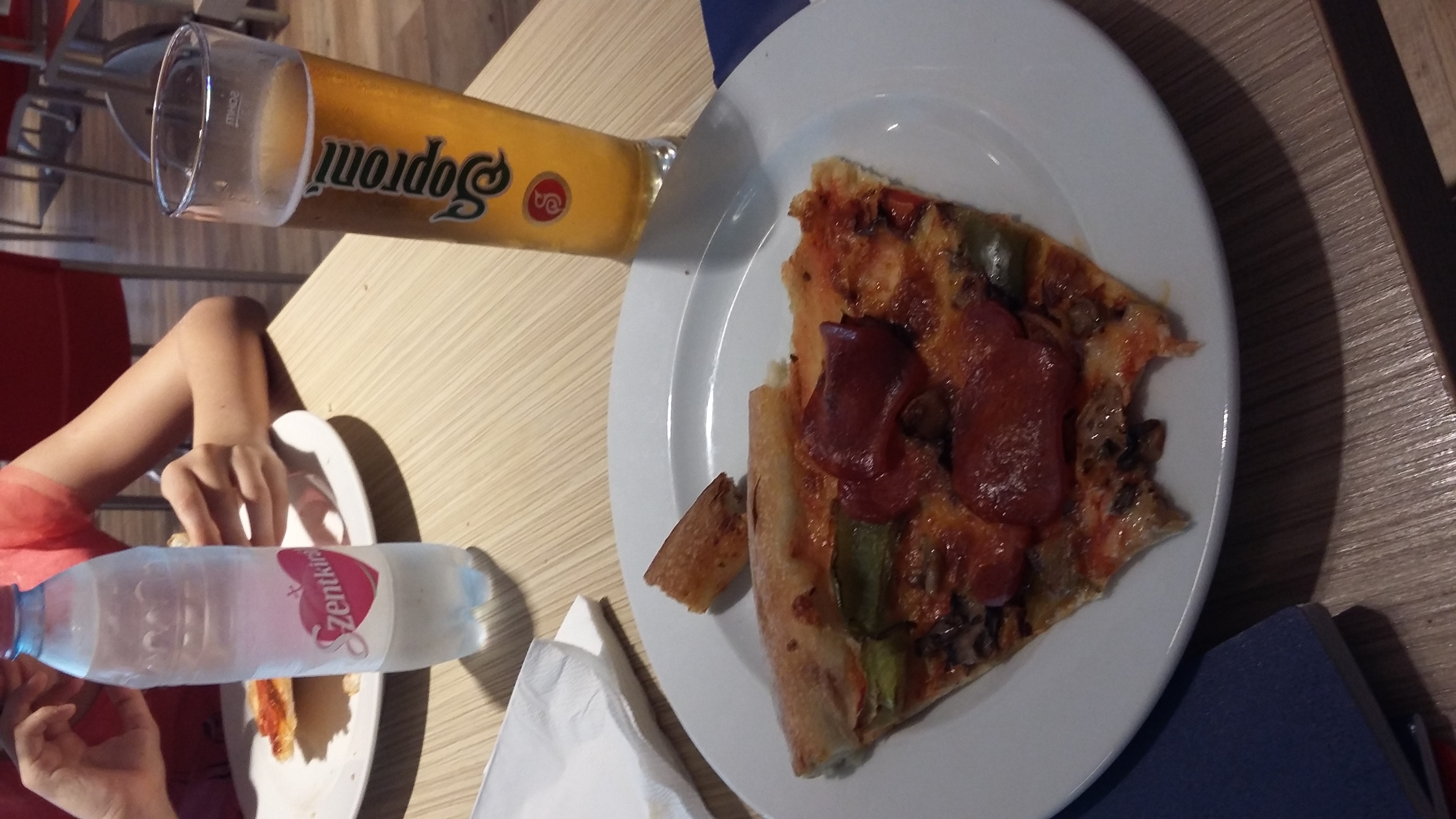 Итого , после 30 минут беготни по терминалу и бессмысленных разговоров. У дочки - пицца + вода, у жены - пицца + бокал вонючего кислячего вина, явно порошкового , вроде тех, что в АТБ по 30-40 грн за бутылку, у меня - 0,33 л !!! местного пива ( Хайнекен - только за деньги!) + все та же пицца.