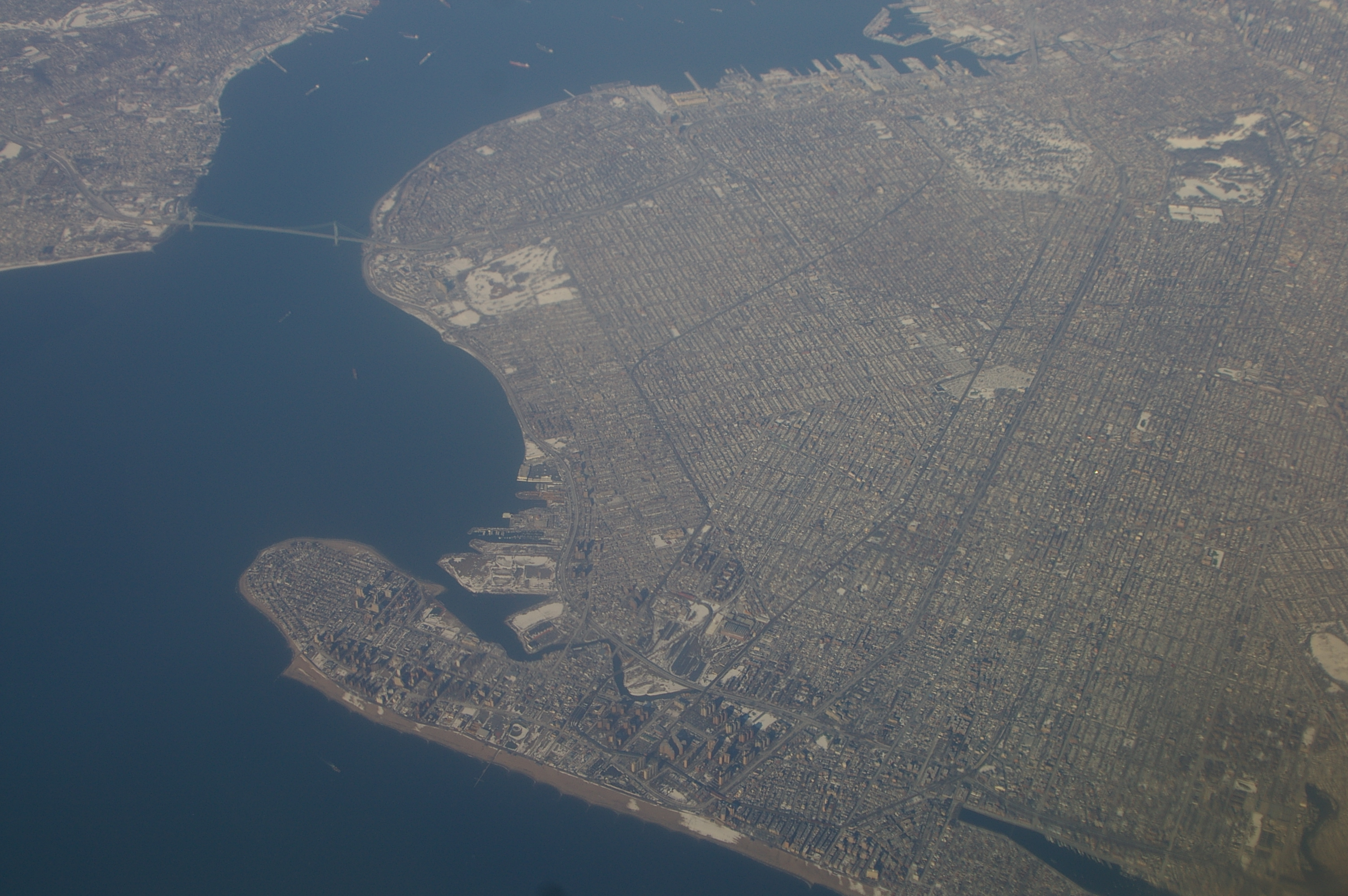 Часть Бруклина и Квинса на переднем плане и практически весь Манхеттен: до "сотых" улиц. Вверху кадра--Нью Джерси--"другой мир" по мнению жителей Большого Яблока.