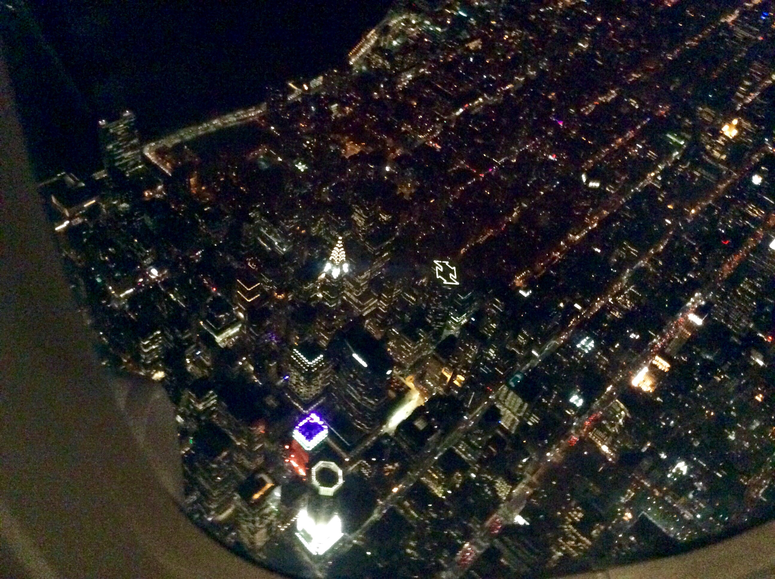 Мадам в Ванкувере сделала мне прекрасную услугу, посадив меня на этом рейсе у окна слева в зоне preferred seating (сразу за бизнес-классом). Пространство для ног там было заметно больше. Кроме того, она сделала то, о чём я только мечтал. При подлёте к Нью Йорку самолёт стал огибать ночной Манхеттен ПРОТИВ ЧАСОВОЙ СТРЕЛКИ, так что я наслаждался отличным видом из окна. На коротком рейсе платное питание не предлагалось. Стандартные напитки и пачка крекеров.