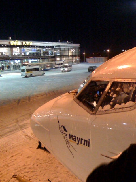 В "чистой" зоне открыли кафе Коста-Кофе (это их единственная точка в Украине) с маленьким американо + молоко за 43 гривны (без молока--35). Там я встретил знакомую шведку, летевшую в Стокгольм первым рейсом ВиззЭйра--на табло уже горело сообщение о задержке её рейса почти на час. Посадку на мой рейс объявили где-то в 6.05, и все стали спускаться в автобус, который никуда не трогался добрых полчаса, а продолжал стоять с открытыми дверьми (на улице было -11). Наконец мы моехали. Сделав круг почёта, автобус практически вернулся к тому же месту, с которого уехал, т.к. наш самолёт стоял прямо напротив "нашей" двери--метрах в 50-ти. Все сразу ринулись на трап, но, т.к. внутри каждый стряхивал снег и снимал кучу одежды, на трапе пришлось постоять и помёрзнуть хороших минут 5. С трапа можно было созерцать кабину пилотов нашего "Маугли", а также снег, прилепившийся ко всем выступающим частям самолёта. Когда все зашли расселись, отдельным автобусом подвели пассажиров с маленькими детьми--хорошо хоть их не додумались держать на морозе (то в автобусе, то на улице) полчаса.