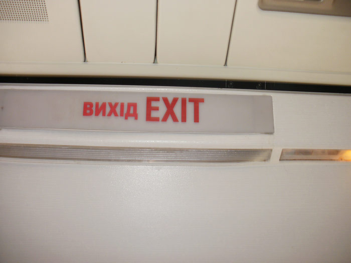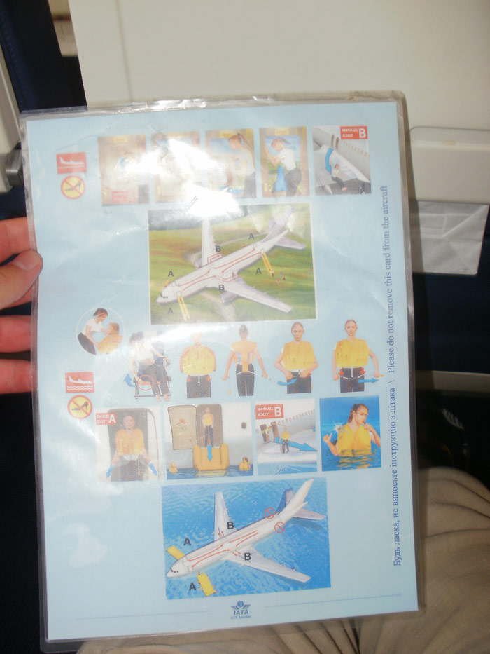 я сидів сам (як завжди:) біля аварійного виходу, таким чином мав багато місця для ніг. І тут коли стюардеса пояснювала як надувати жилети, тех безпеку, потім вона підходить до людей хто сидить біля аварійного виходу і пояснює, щоб у разі чого ми були на чеку і не заблокували вихід, також ми маємо прочитати інструкцію на стіні як відкривати двері. Ну я собі думаю, треба прочитати... і там на дверях 2 ручки, знизу та зверху для їх відкриття. Я думаю попробую взятись за ручки (просто цікаво чи рука залазить) нижня металева приварена, нормально рука влізла.. верхня пласмасова. і я тільки засовую туди руку (тільки торкнувся) як вона відпала на землю. гряскіт такий, покотилась під сусіднє сидіння. Стюардеса Зоряна прибігла і каже: " Що ви зробили? я кажу нічого.... що ви відкривали? чому воно відпало? я кажу... що ви хочте від мене, я нічого не знаю... вона сама в шоці, оскільки народ взаді весь з великими очима, весь середина літака яка то помітила тільки і дивилась на то... відповідно як то відвалилось то у видно було середину нутрощів літака (там якісь дротики, труби, тощо