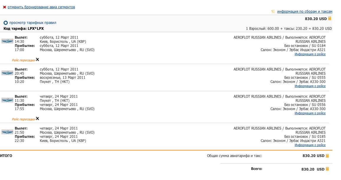 Привет всем! Вот, потихонечку прощупываю Тайланд на весну. Нашел интересное предложение Аерофлота. с 29.12.2010 они запускают рейс Москва-Пукет. Цены из Киева с нормальным временем на стыковку от 830 долларов США, что для маршрута Киев-Пукет есть большой гуд. Киев-Бангкок + лоукост до Пукета может быть и дешевле, но требует перерегистрации в BKK и ризка не успеть на собственную стыковку. А тут вуаля и мы на Пукете.