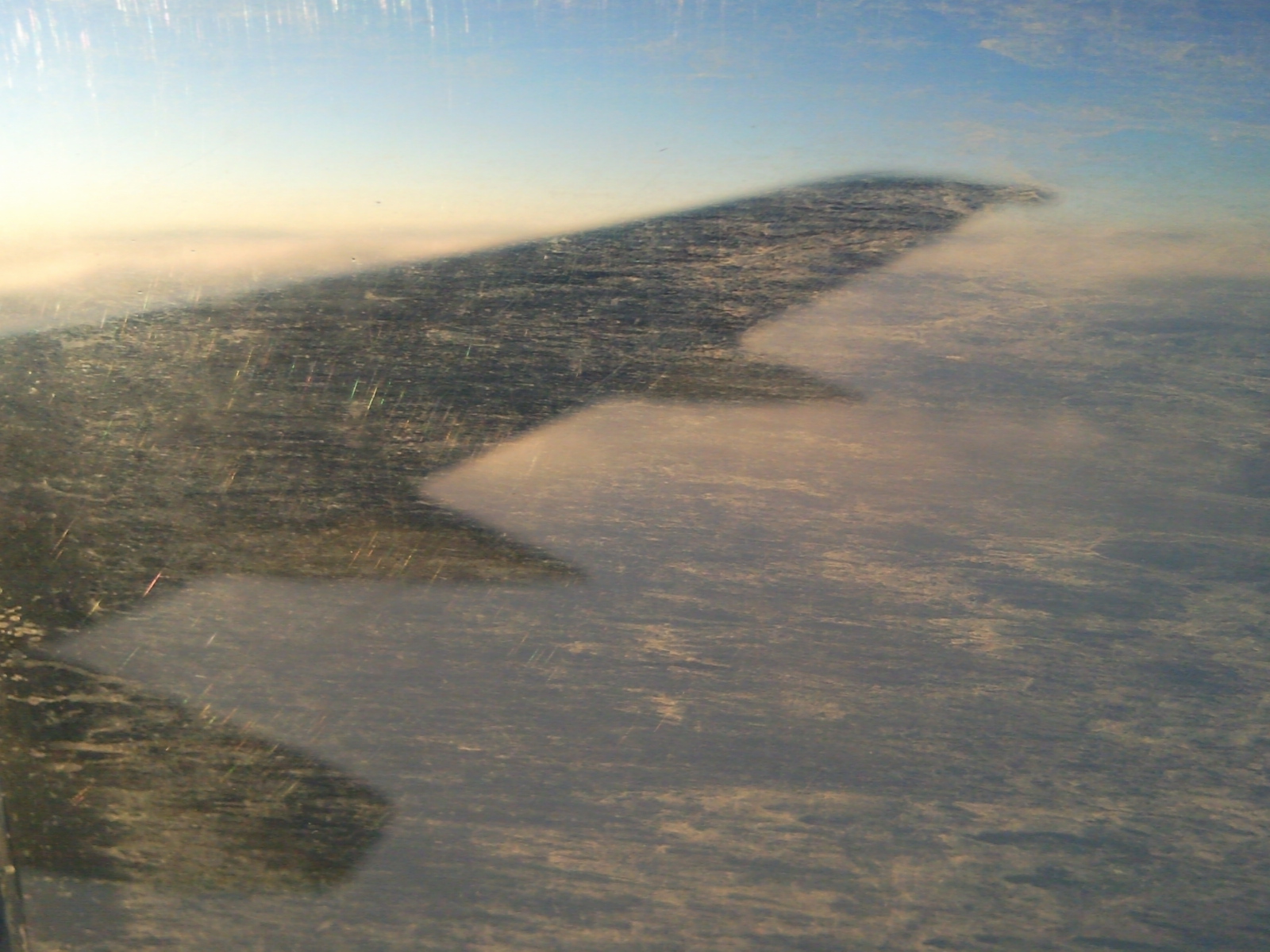 Прошарок хмар був настільки великим, що десь приблизно на висоті 8км. ми вилетіли з нього. Вікно майже повністью було замазане сумішшю проти льоду та грязюкою, тому соррі за фото. Взагалі рейс був на висоті не більш 9500м. і туди і назад. Я перед відльотом стежив за Ютейр Україна і всі ці рейси виконувались на такій низькій для цоього типу літака висоті. За нами як раз йшов МАУ В737-800 - висота 11300м. Здається чим вище, тим меньше палива витрачаєш. Там звичайно можуть бути більші вітри, але більшість літаків там. І ешелон був не дуже перевантажений. Десь біля 19.00 із запізненням на 1,5 години пілот не акуратно (на 3 балли) посадив літак в Хургаді.