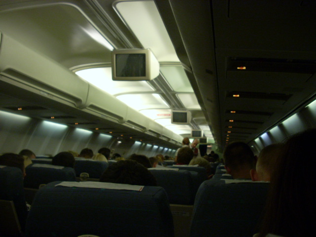 Сидіння в літаку з тканини, пошарпані, не зручні. В мене було місце 21F. В мому сидінні завжди вилітав столик, тому спині було дуже незручно. Місця для ніг більш меньш було достатньо для такого перельоту - 76 см. Компоновка салону - все економ - 168 місць. Стюардеси не дуже привітні. Іжа завантажувалась в Борисполі фірмою "Київ кейтерінг" (посередні харчі).