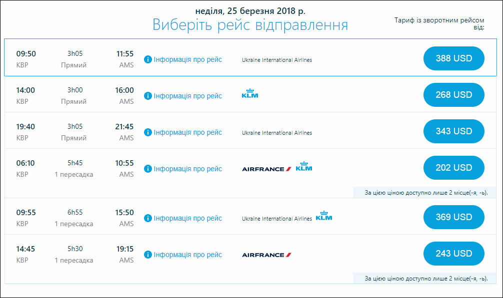 Сейчас KLM выполняет ежедневные рейсы с вылетами из Борисполя в 05:35 и в 14:00. С 25 марта авиакомпания оставит единственный рейс, вылетающий из украинской столицы в 14:00.